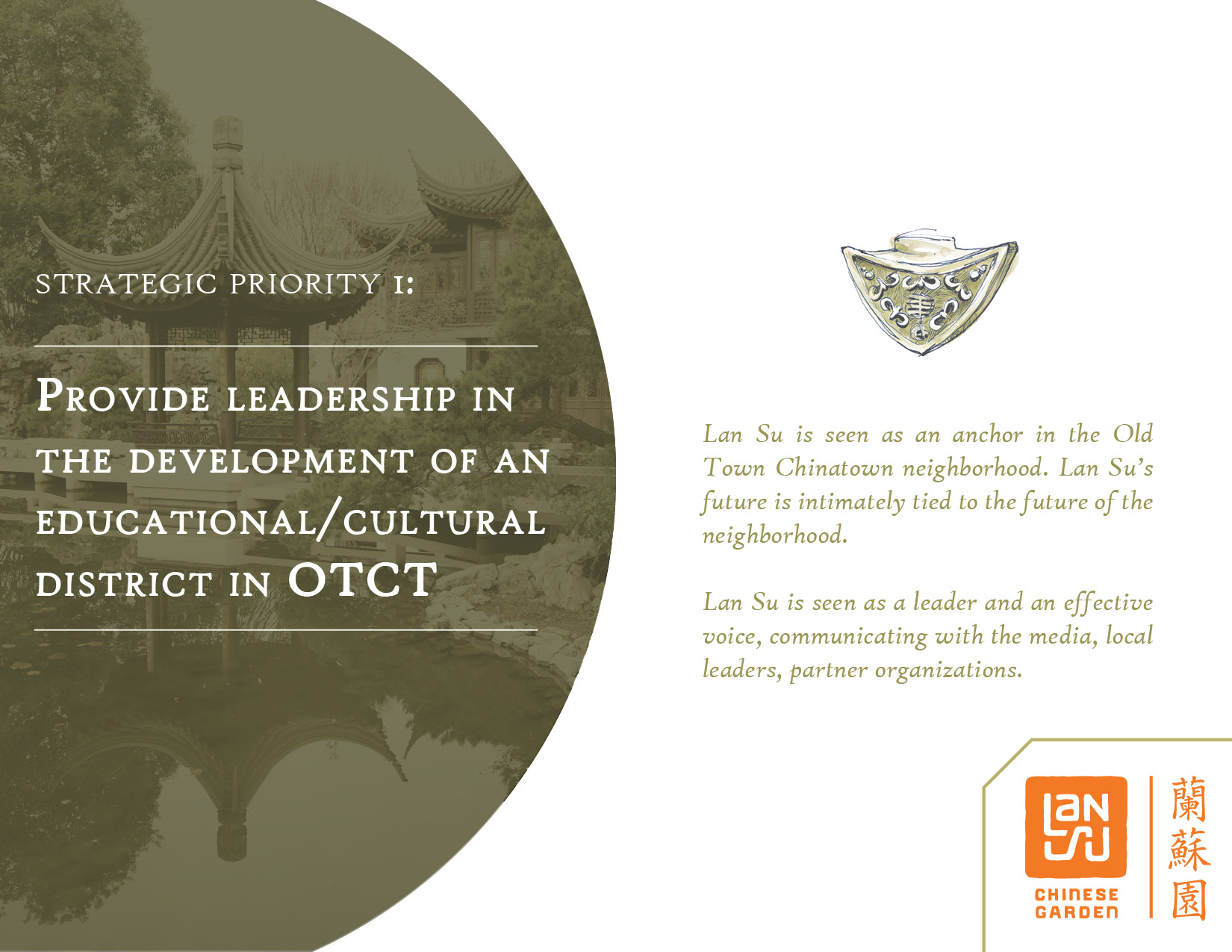 PRESENTATION DESIGNWith the hiring of a new Executive Director in 2020, Lan Su Chinese Garden executive staff and board of directors embarked on an organizational strategy evaluation and planning process. At the end of the process, they had come up with five concerted goals, as well as four discinct values on which to base the organization’s programming and expansion from 2022 - 2024.